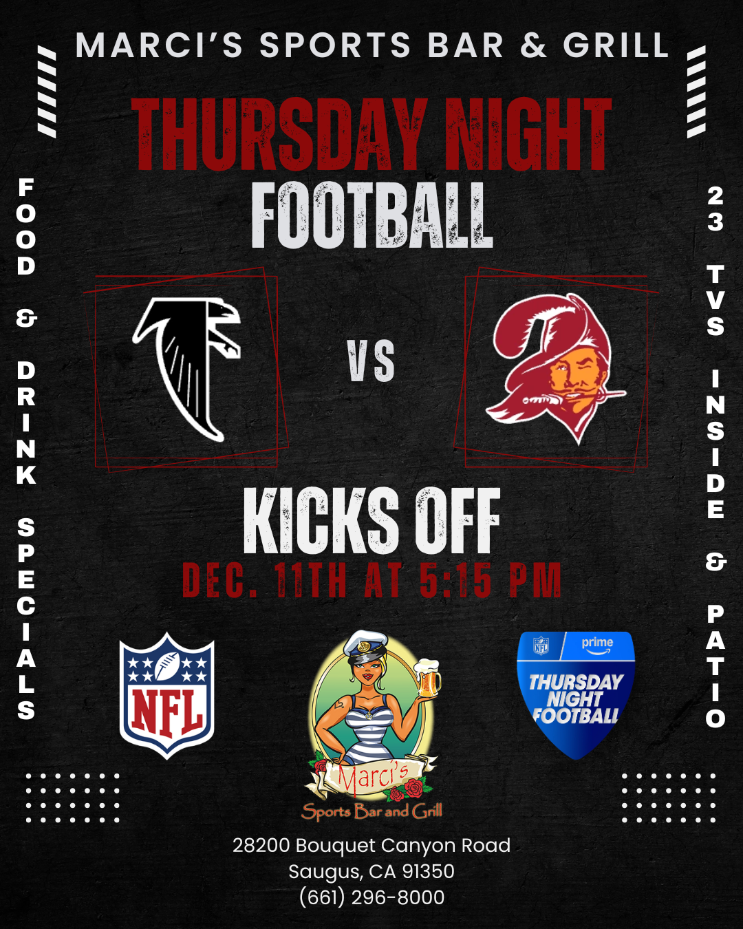 Football fans, it’s time again! Thursday, December 11, 2025, marks Week 15 of the NFL regular season and the primetime matchup between the Atlanta Falcons and Tampa Bay Buccaneers. When the lights go on and kickoff hits at 5:15 PM Pacific Time (8:15 PM ET), Marci’s Sports Bar & Grill will be your go-to destination for all the thrills, chills, food and fun.