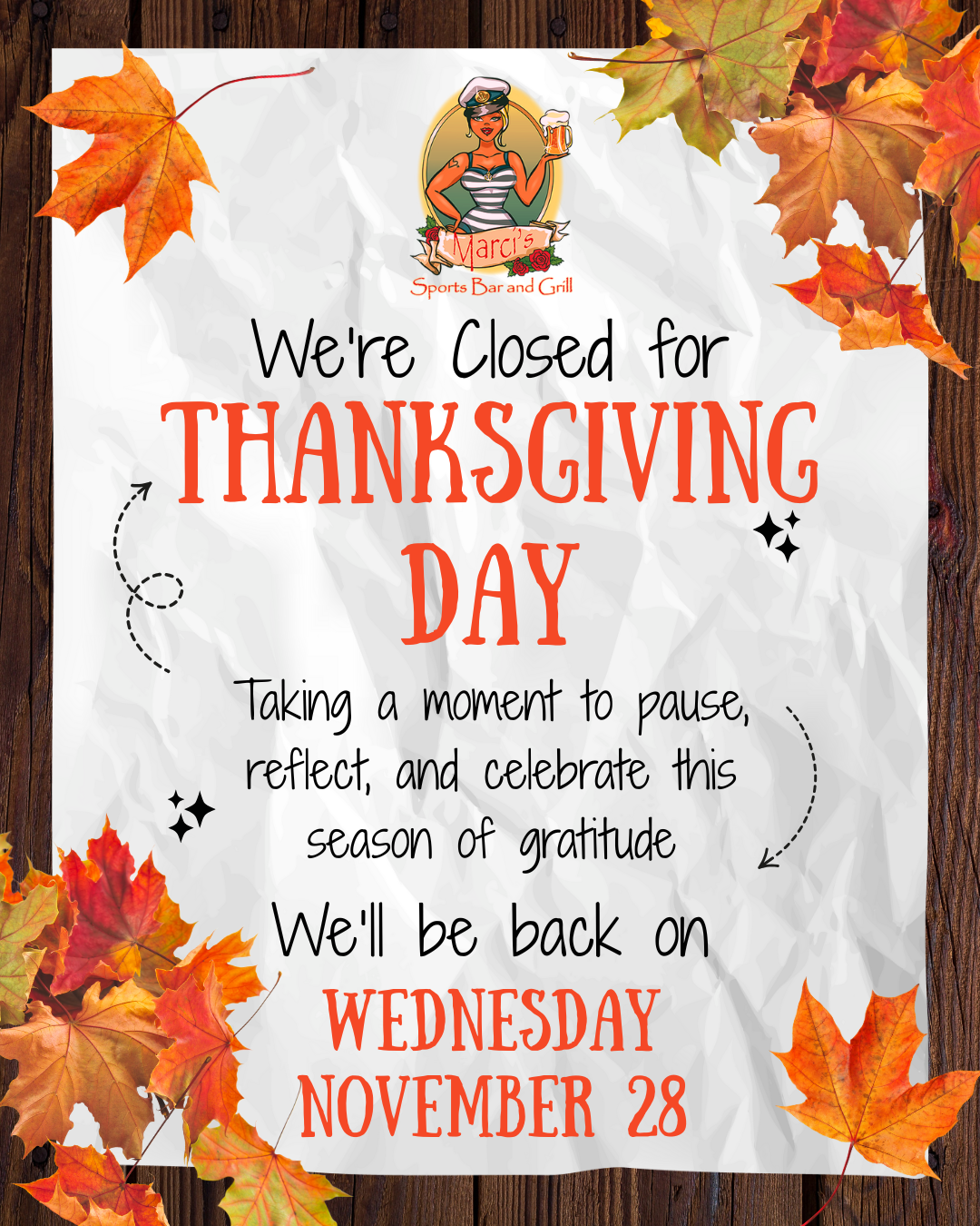 Read MoreMarci’s Sports Bar & Grill will be CLOSED today in observance of Thanksgiving Day so our team can enjoy the holiday with their loved ones....