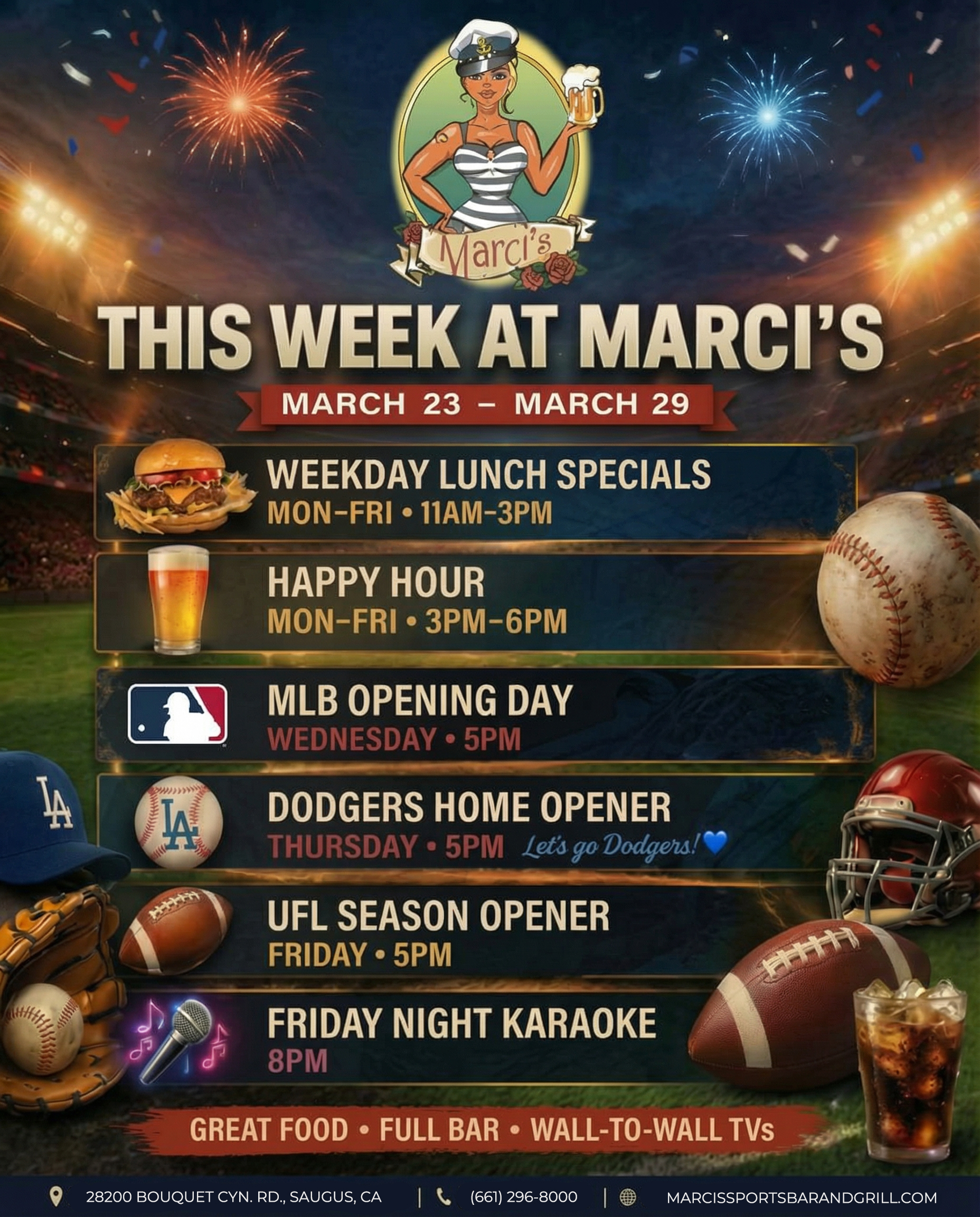 It’s one of the biggest sports weeks of the year, and Marci’s Sports Bar & Grill is the place to catch every moment. From MLB Opening Day to the Dodgers Home Opener and the return of football with the UFL, there’s something happening all week long.